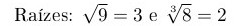 Raízes: \(\sqrt{9} = 3\) e \(\sqrt[3]{8} = 2\)